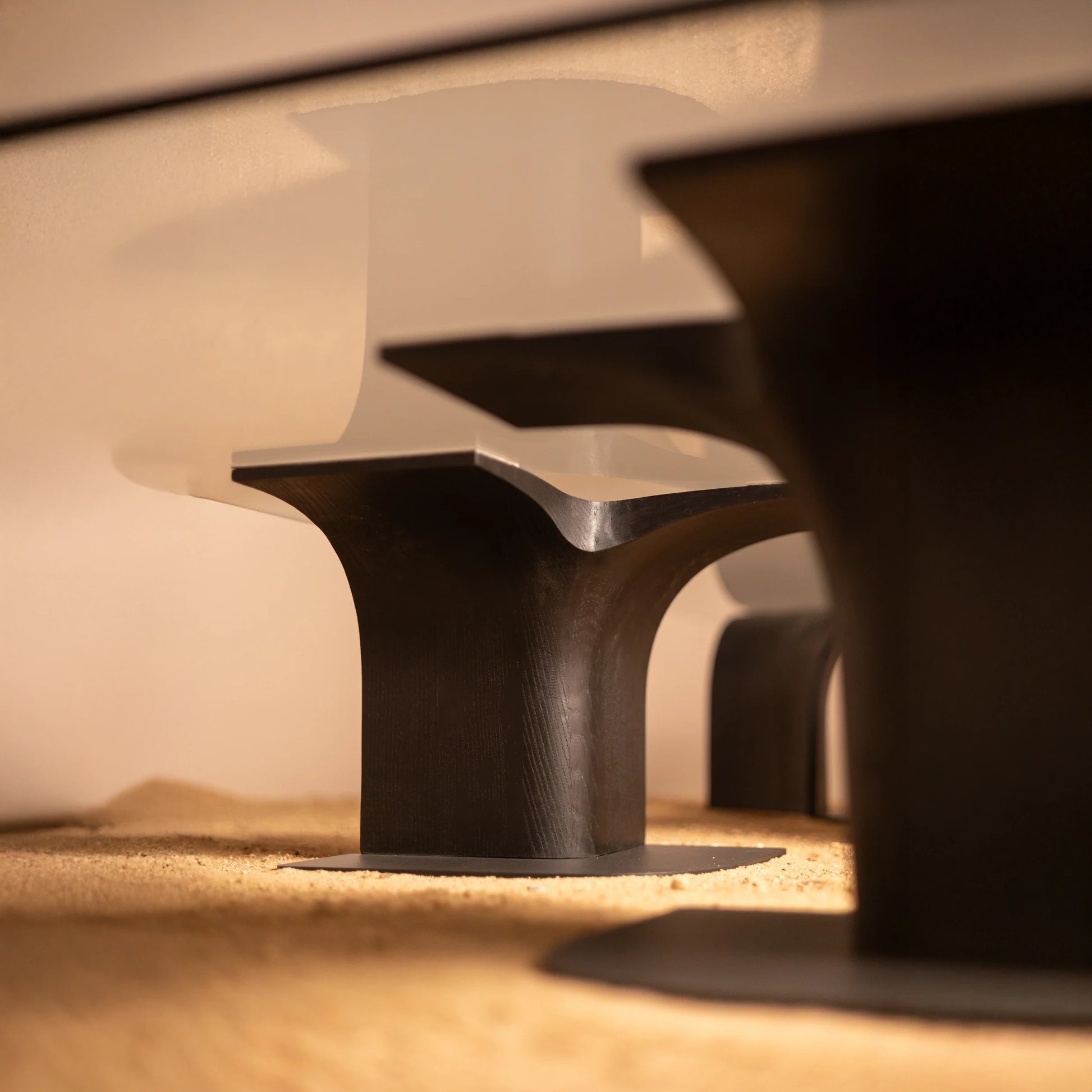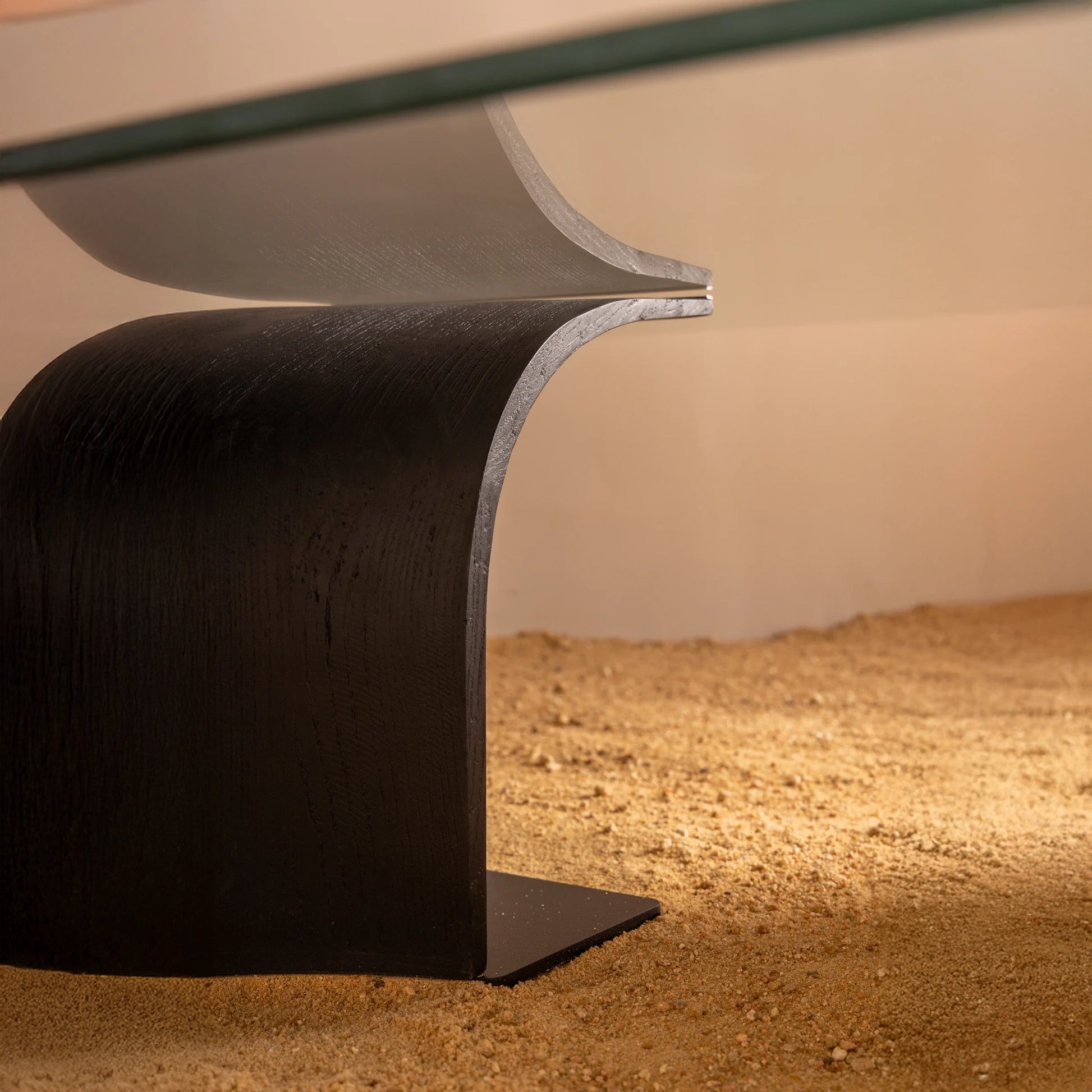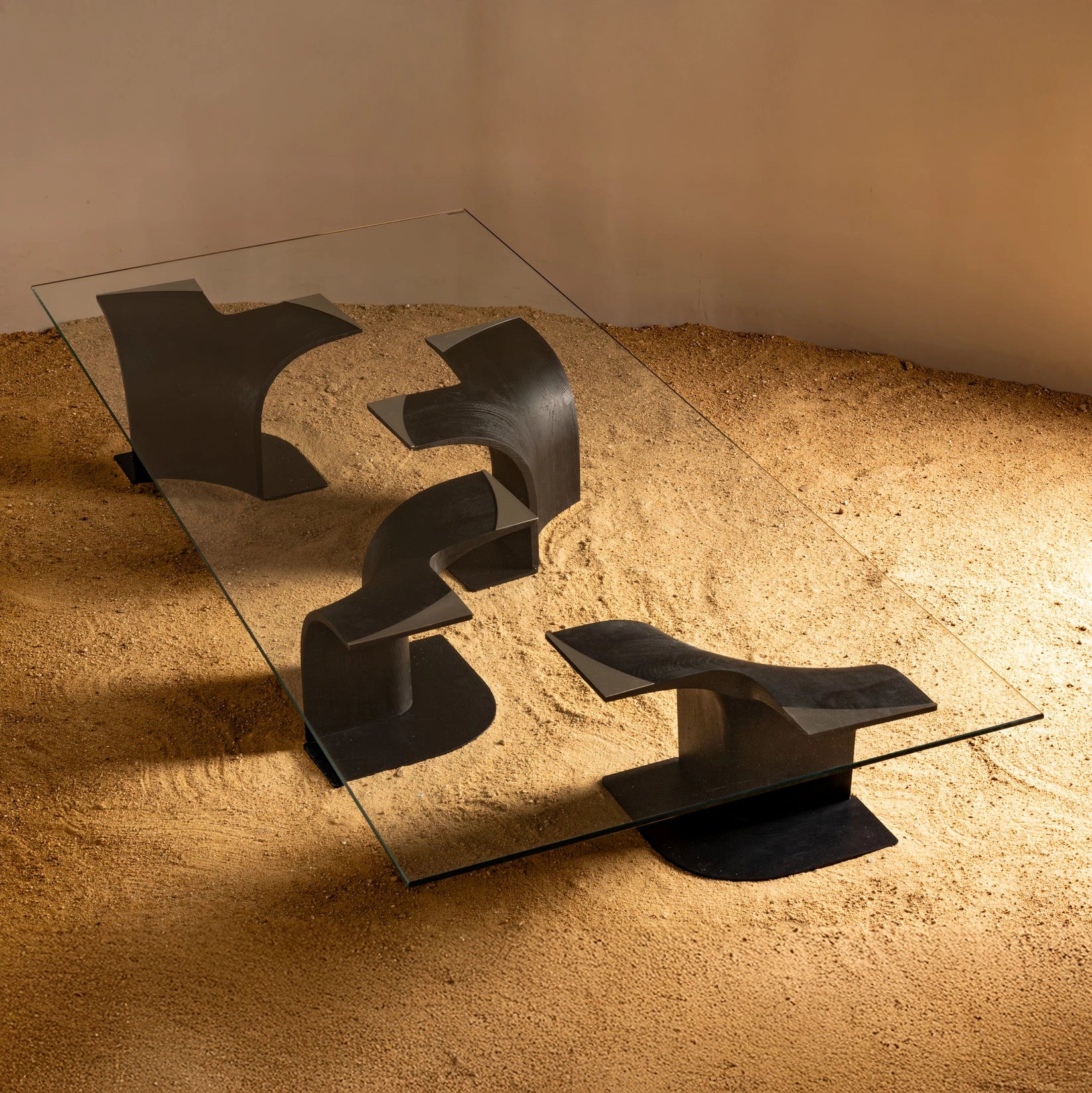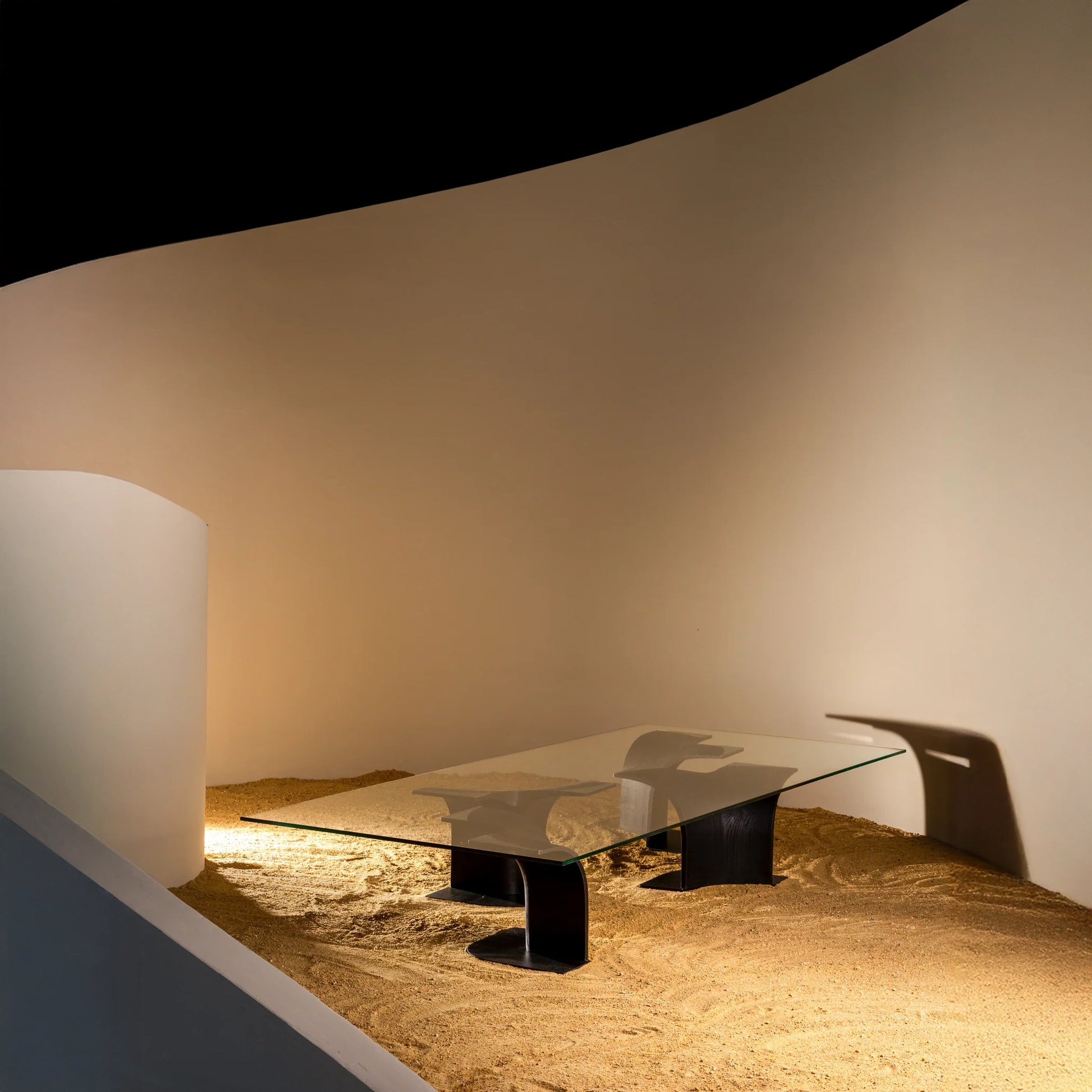 A table as a canvas; its glass top a mirror to the sky, its base firmly rooted to the earth. A reflection of shifting horizons, where light and space intertwine. Transparent yet grounded, expansive yet contained; an ever-changing story shaped by time.