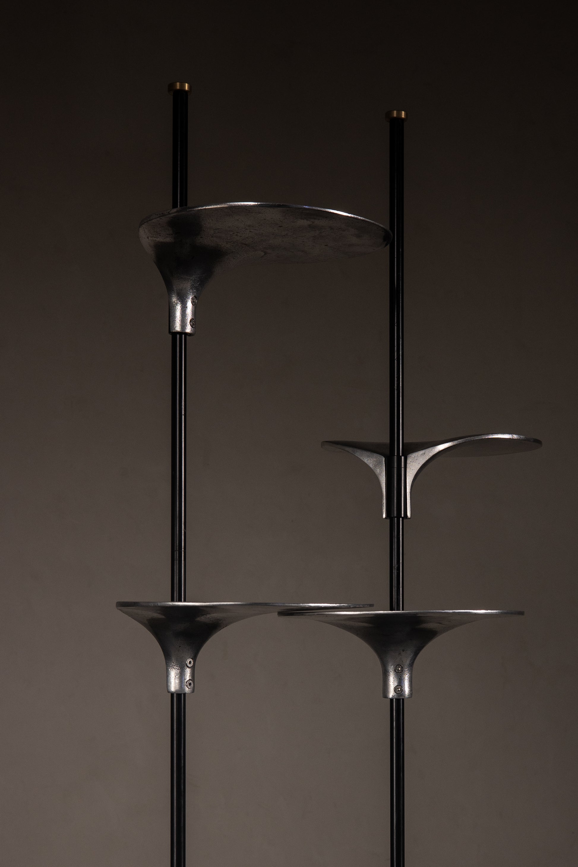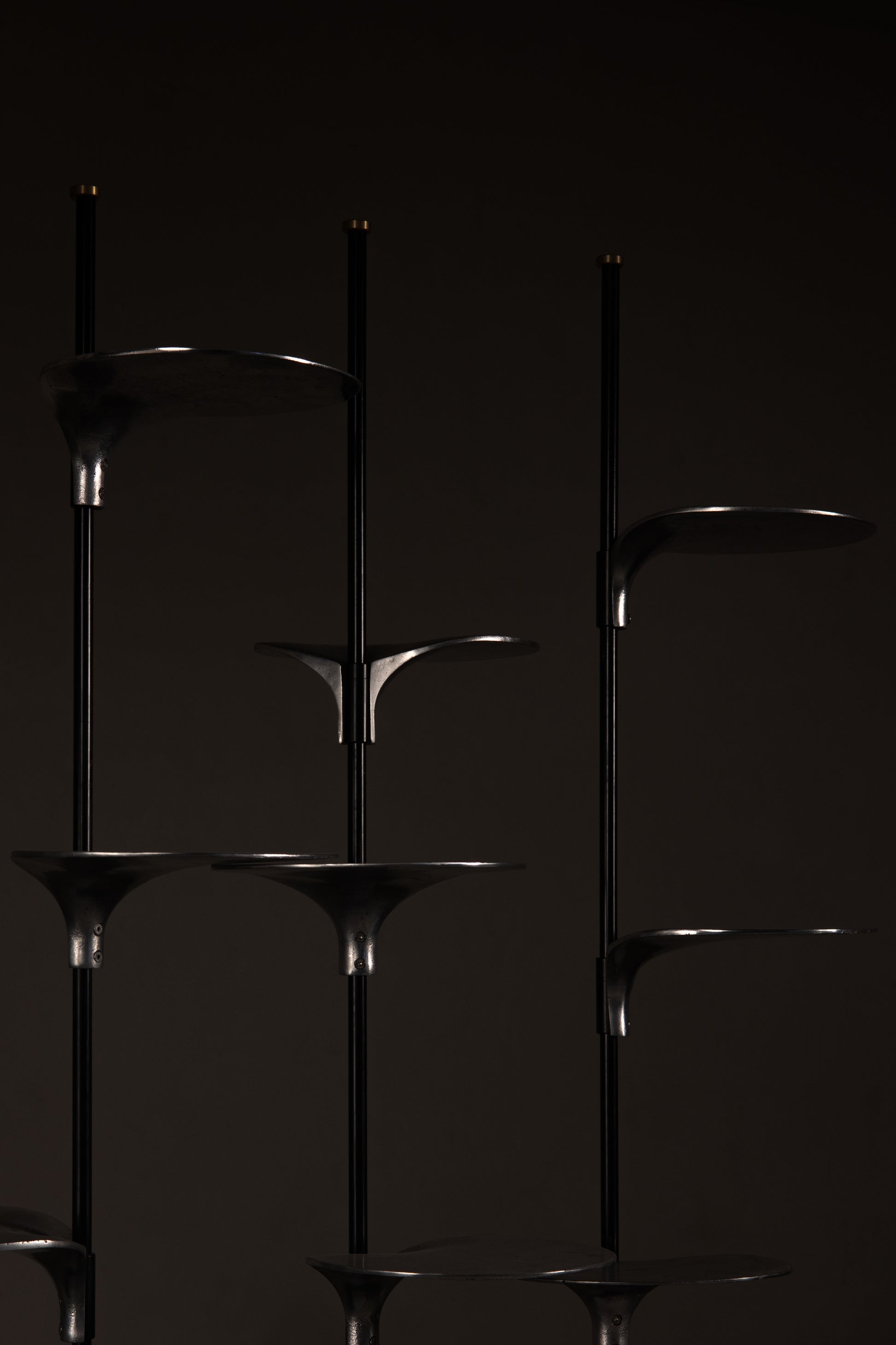Minimalism with impact. Nerine’s sand-cast aluminium shelves, shaped like lily pads, slot effortlessly onto MS pillars with solid brass detailing. A veneer base ensures stability, and the height can be customised to stretch from floor to ceiling. Freestanding height is limited to 1800mm, making Nerine a versatile and sculptural addition to your space.